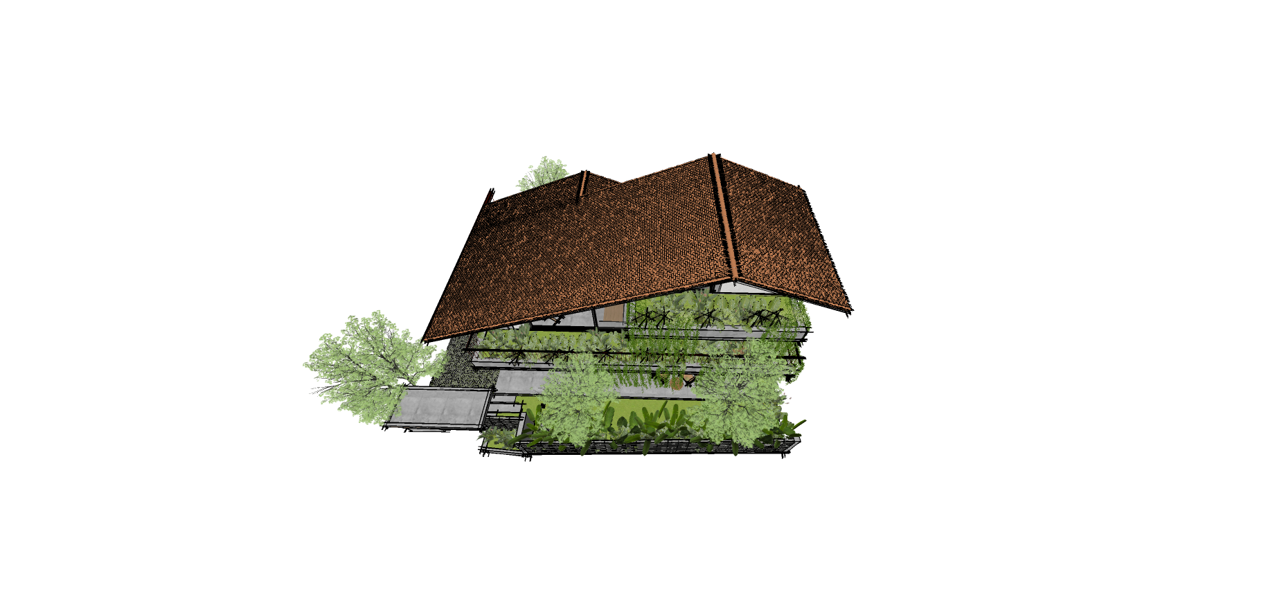Điểm nhấn ấn tượng đầu tiên chính là phần mái dốc truyền thống được cách điệu một cách đầy sáng tạo. Mái ngói đỏ rực rỡ không chỉ gợi nhớ về những giá trị truyền thống mà còn tương phản mạnh mẽ với những đường nét kiến trúc hiện đại, tạo nên một sự đối lập thú vị và thu hút mọi ánh nhìn. Các khối nhà được sắp đặt một cách có chủ đích, tạo ra những góc cạnh độc đáo và những khoảng không gian mở, đón trọn ánh sáng tự nhiên và luồng gió trong lành.