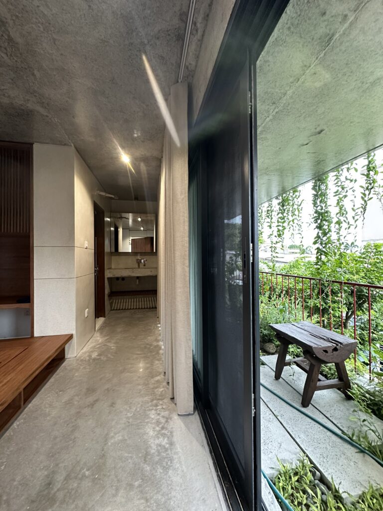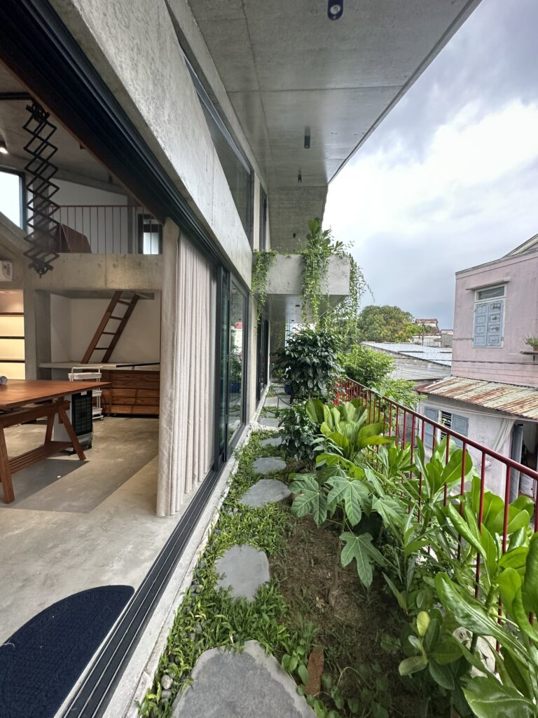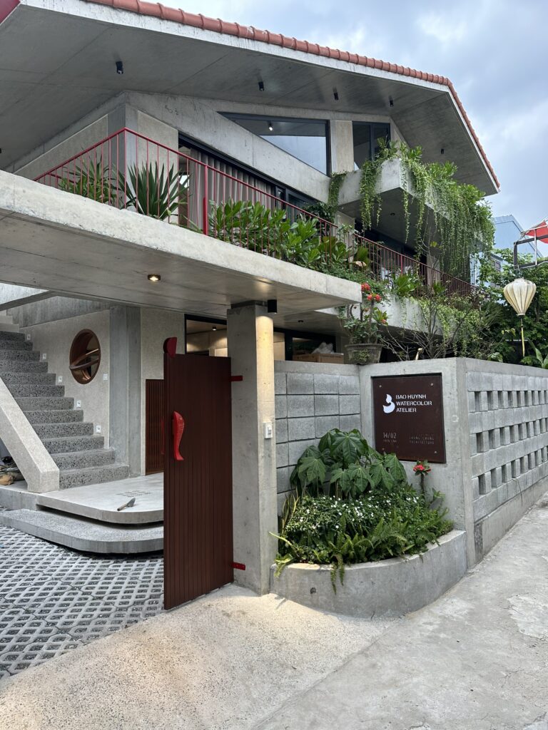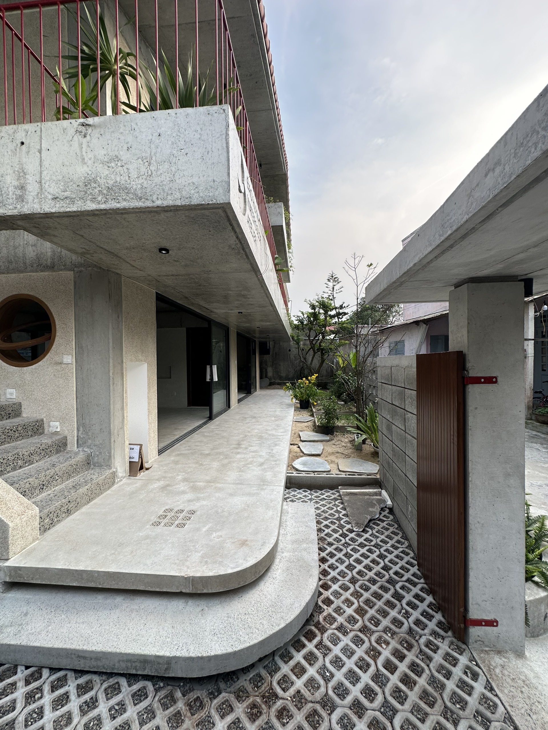 Sự lựa chọn vật liệu bê tông thô không chỉ mang lại vẻ đẹp bền vững, mạnh mẽ mà còn tạo ra một nền tảng vững chắc để tôn vinh vẻ đẹp của cây xanh và các chi tiết kiến trúc khác. Đặc biệt, những đường lan can màu đỏ nổi bật không chỉ đảm bảo an toàn mà còn là một điểm nhấn thị giác đầy nghệ thuật, tạo nên sự sống động và cá tính cho tổng thể công trình. Đây là sự đối thoại tinh tế giữa sự mộc mạc và sự phá cách, giữa truyền thống và hiện đại.