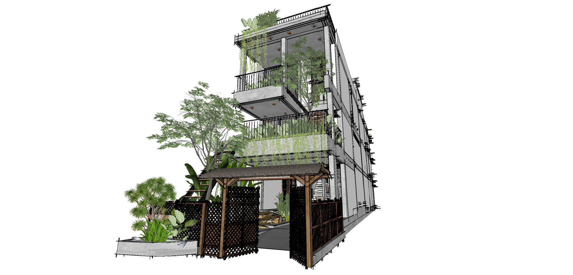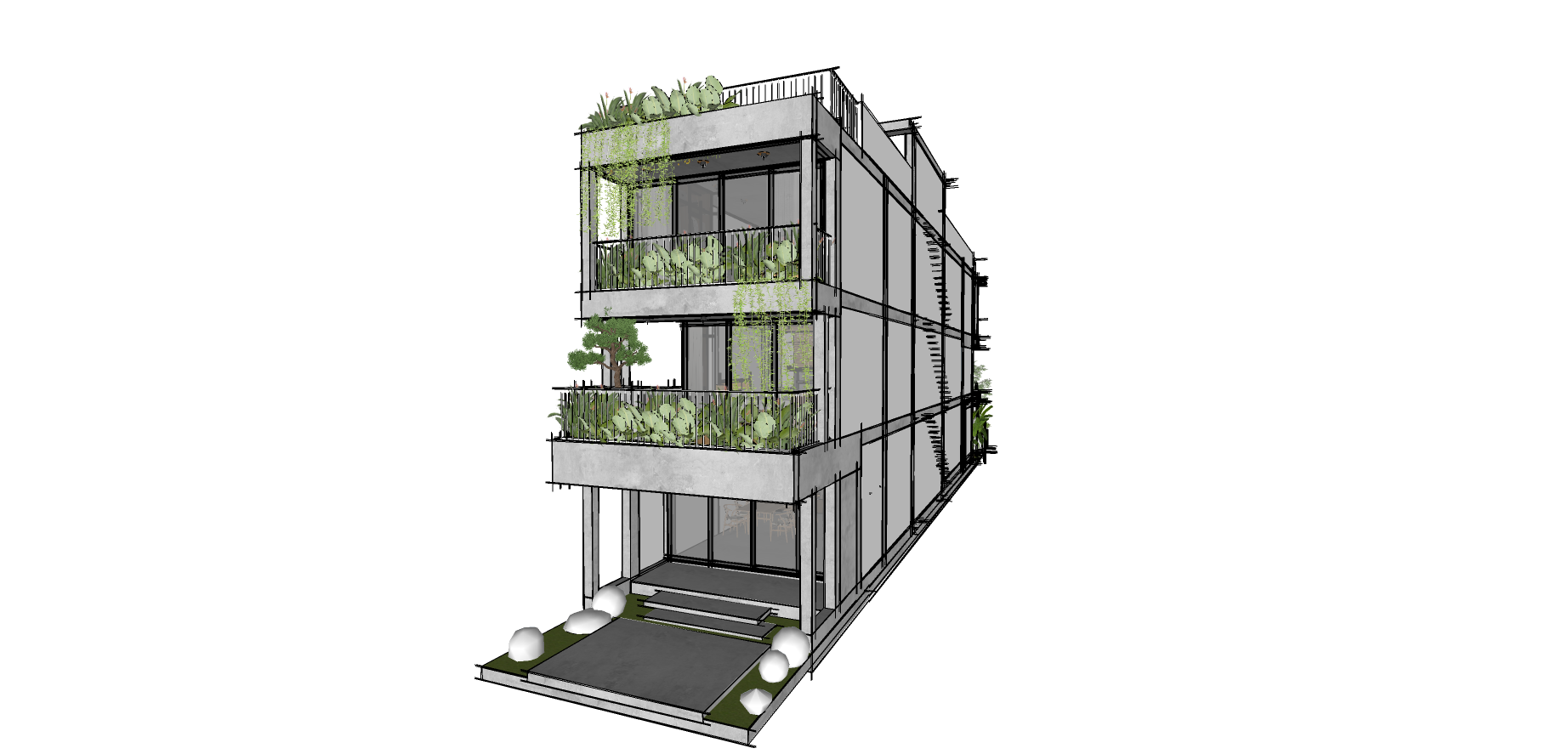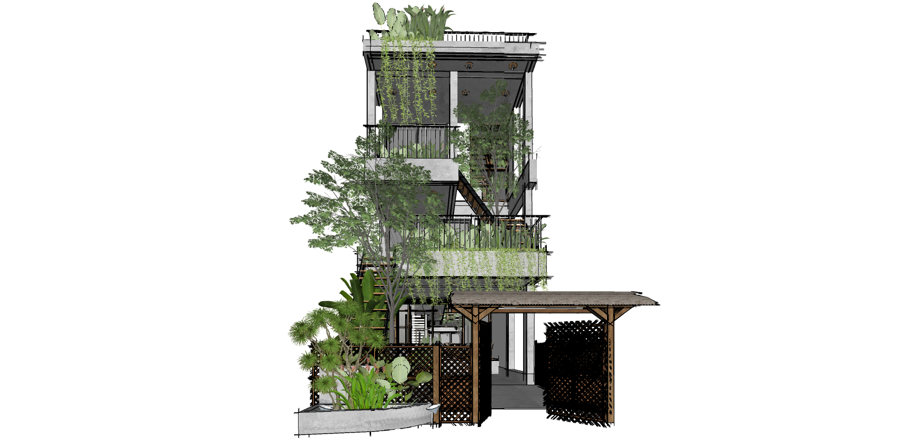 Mặt tiền ngôi nhà được thiết kế như một tấm rèm xanh – nơi cây cối không chỉ là yếu tố thẩm mỹ mà còn trở thành lớp “vỏ thứ hai” bảo vệ công trình khỏi nắng gắt và khói bụi phố thị. Từng tầng công trình là từng lớp vườn – xen kẽ giữa khoảng trống và khoảng đặc, giữa bóng mát và nắng nhẹ, giữa khung bê tông chắc chắn và mảng xanh mềm mại.