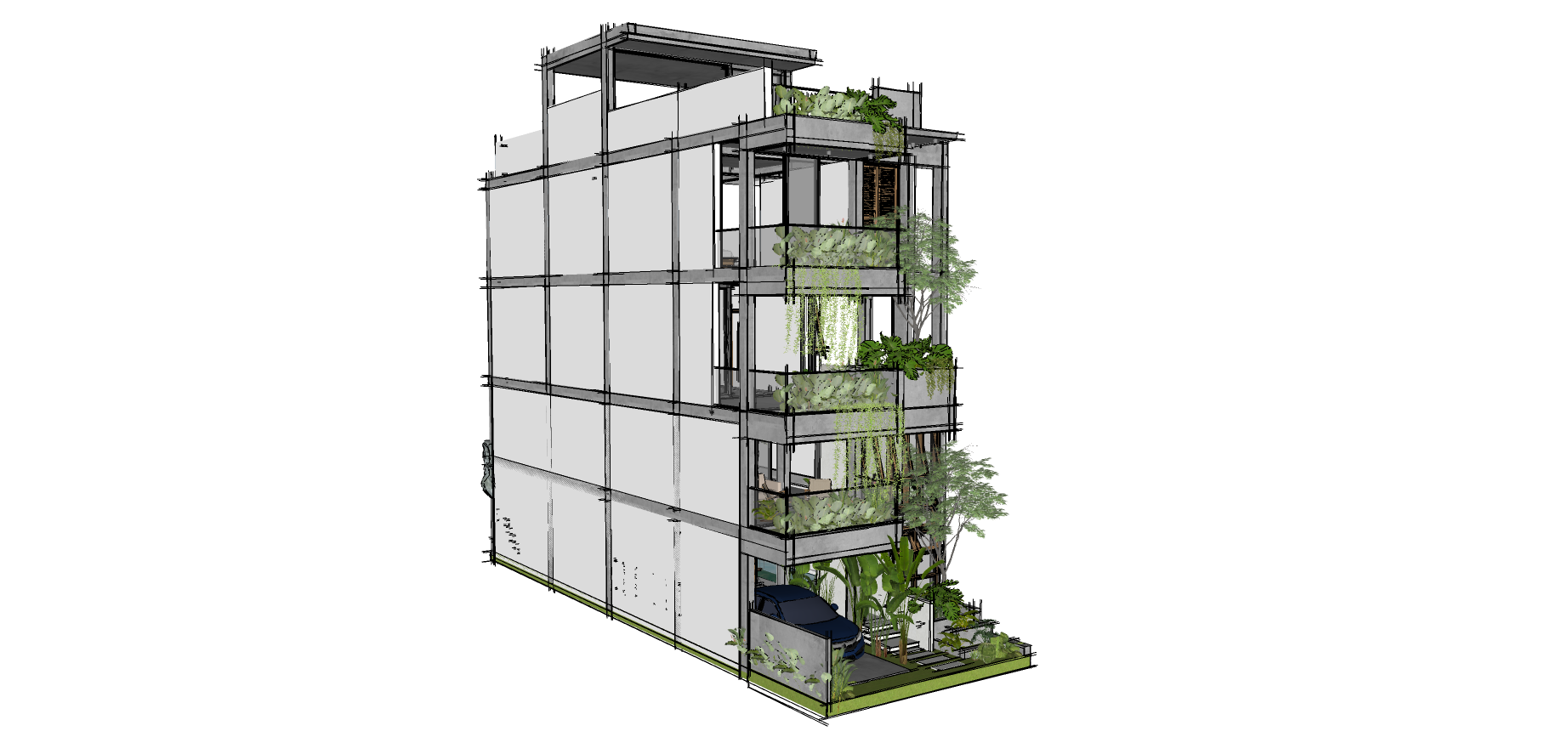 Các ban công đan cài dây leo rủ, chậu cây lớn nhỏ xen kẽ – khiến mặt đứng công trình như được bao phủ bởi một tấm rèm xanh mềm mại. Không gian sống nhờ đó được làm mát một cách tự nhiên, đồng thời tạo nên cảm giác thư giãn, tách biệt khỏi sự ngột ngạt của phố xá xung quanh.
