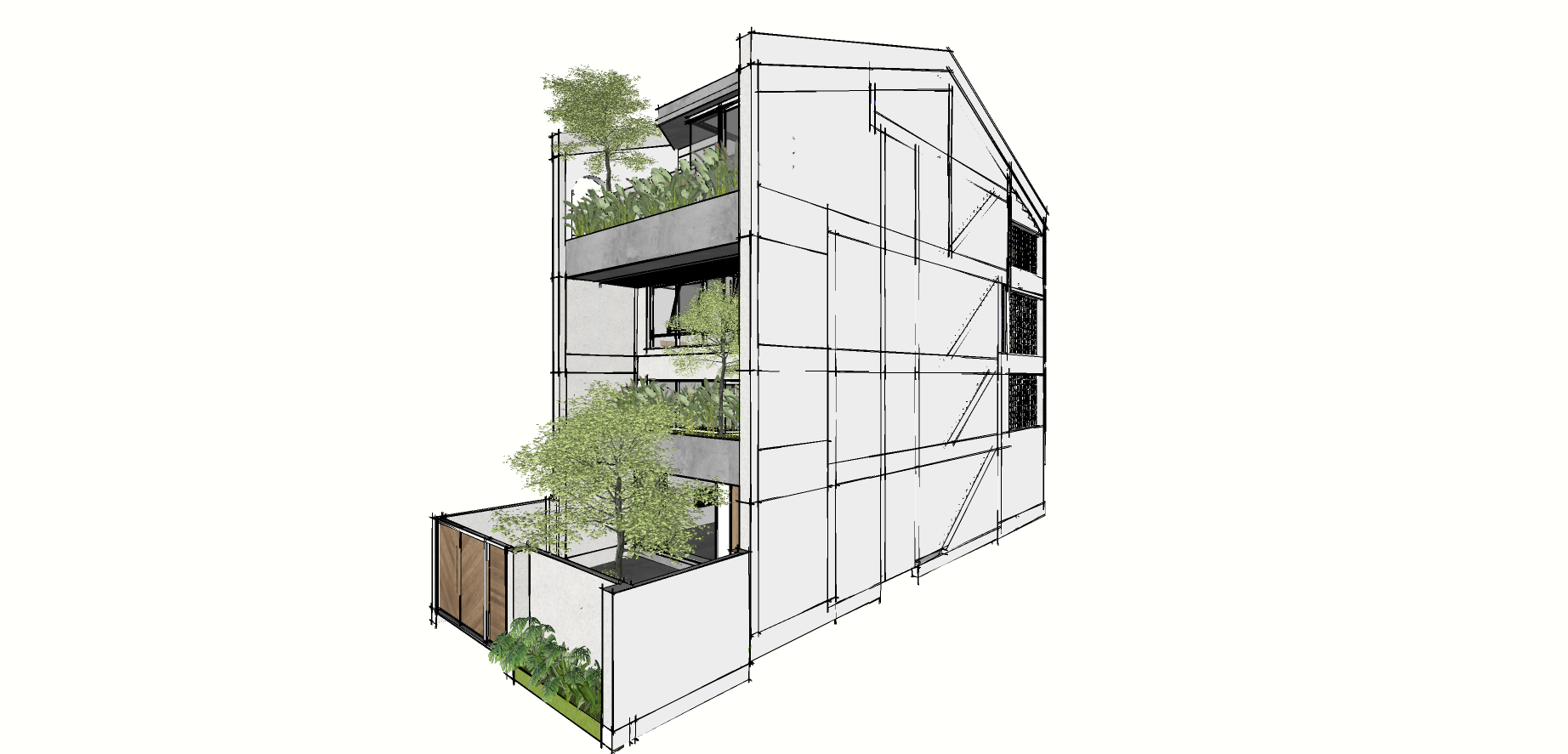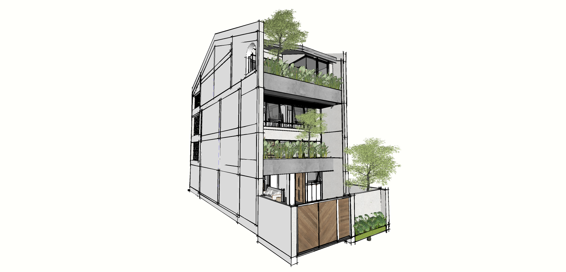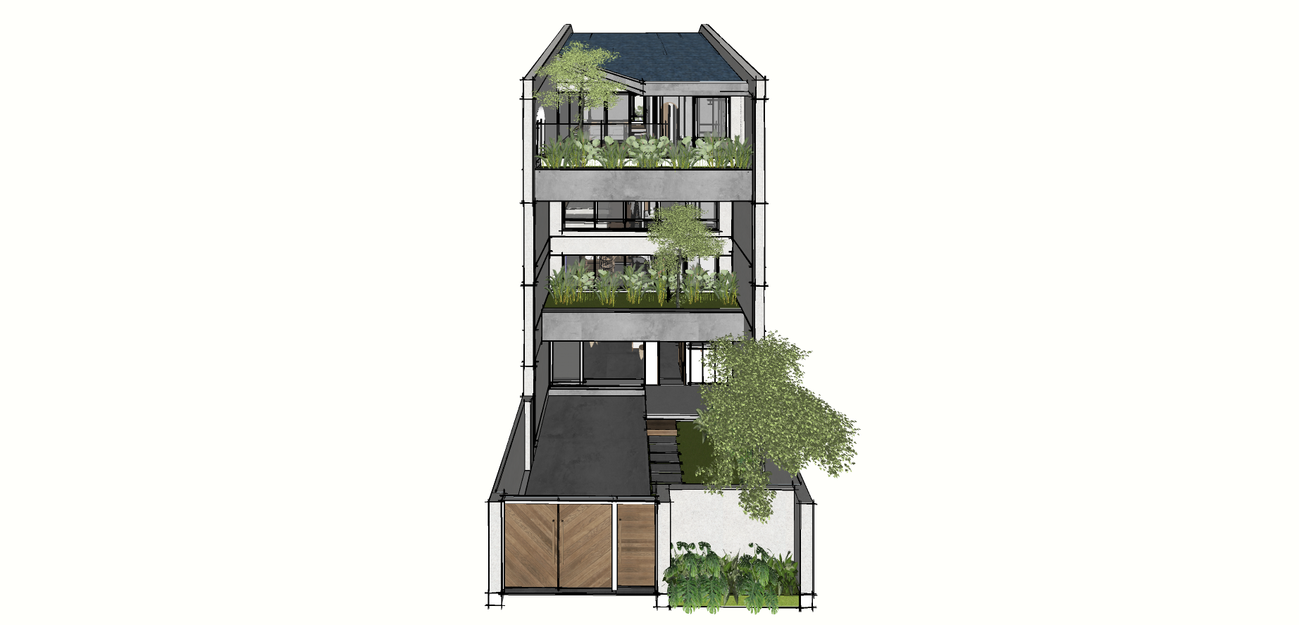 Từ cái nhìn đầu tiên, ấn tượng bởi sự thanh thoát và vươn cao, một điểm nhấn đầy khác biệt trong bối cảnh kiến trúc hiện đại. Mặt đứng được thiết kế khéo léo, không chỉ tạo nên sự riêng tư mà còn tối ưu hóa nguồn sáng tự nhiên và luồng gió đối lưu, mang đến một không gian sống luôn ngập tràn sự tươi mới. Những ban công rộng lớn, lùi sâu và nối tiếp nhau, mở ra những “khoảng thở” quý giá, nơi gia chủ có thể thoát khỏi sự ồn ào và tìm thấy sự bình yên.