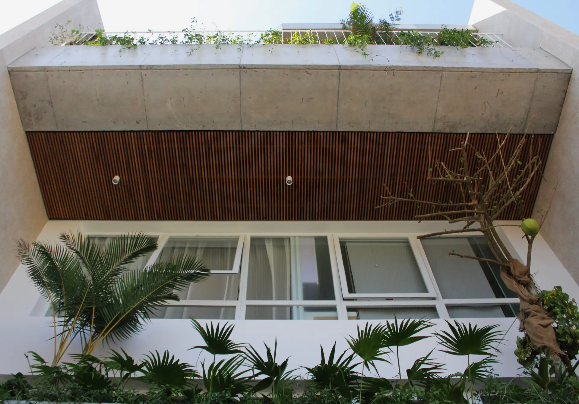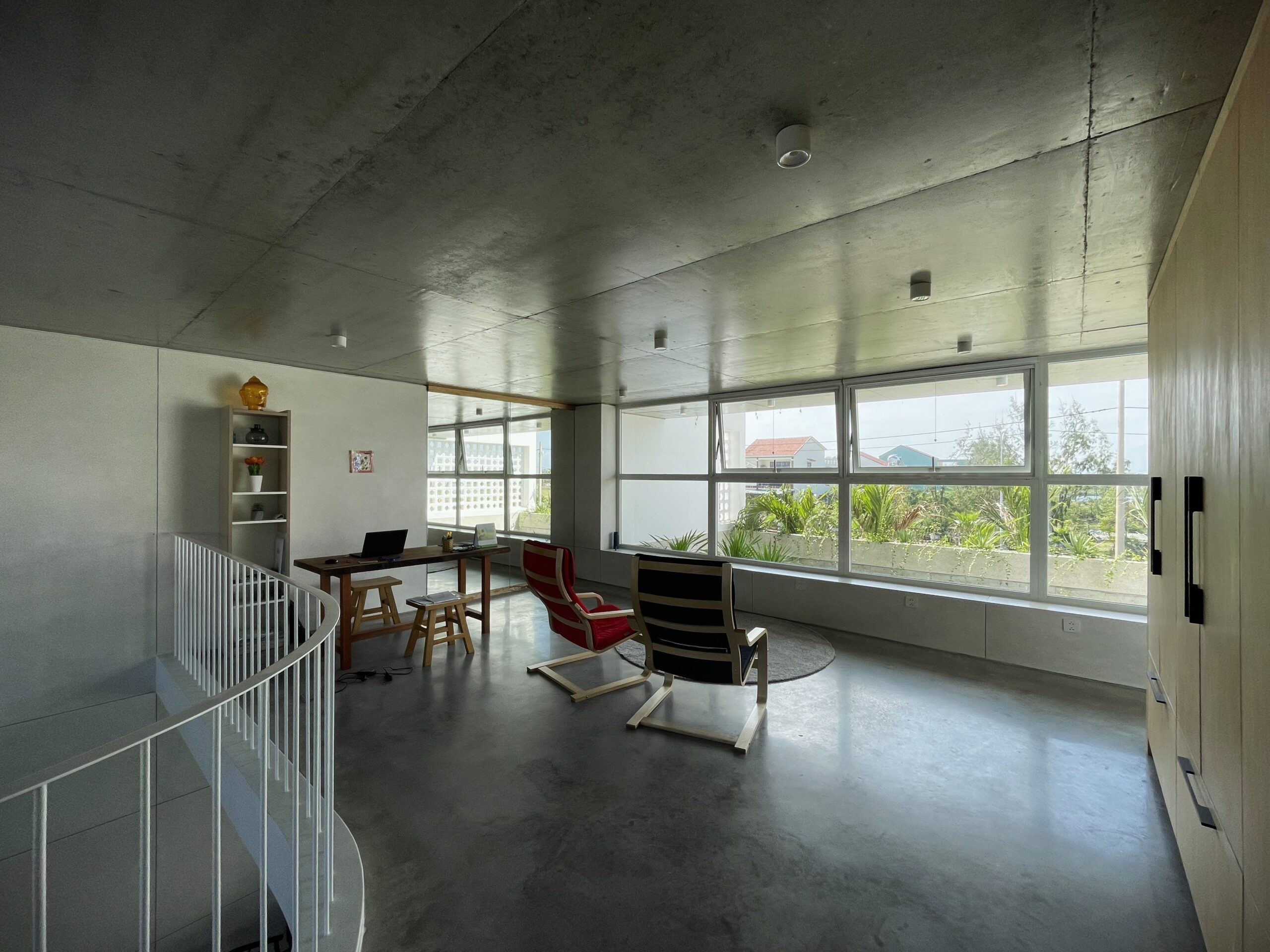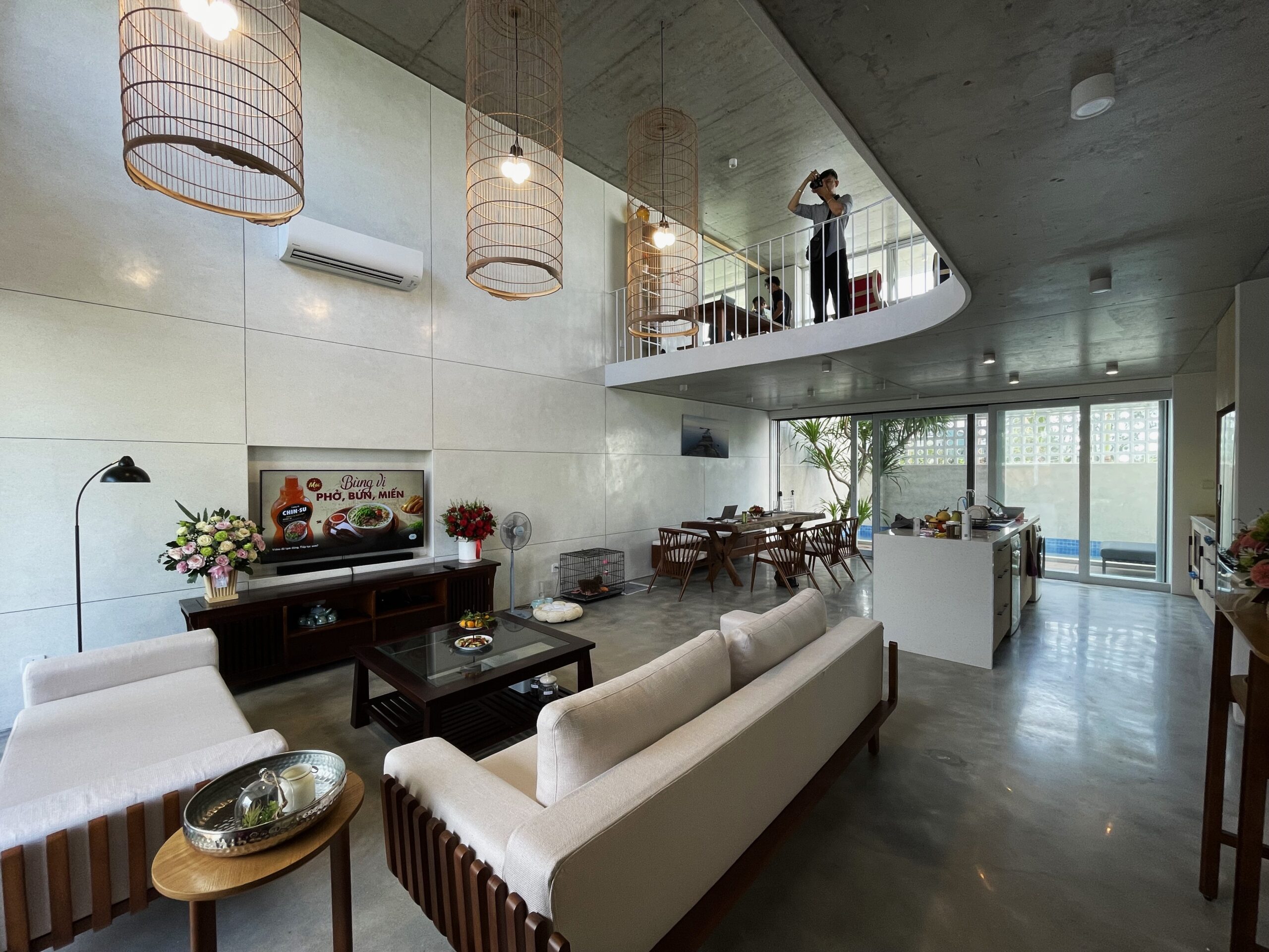 Sự kết hợp giữa chất liệu thô mộc của bê tông và sự ấm áp của gỗ tạo nên một tổng thể hài hòa và tinh tế. Bê tông mang đến sự vững chãi, hiện đại, trong khi gỗ mềm mại hóa không gian, tạo cảm giác gần gũi và thân thiện. Những mảng tường trắng tinh khôi là phông nền hoàn hảo để tôn lên vẻ đẹp của cây xanh và ánh sáng