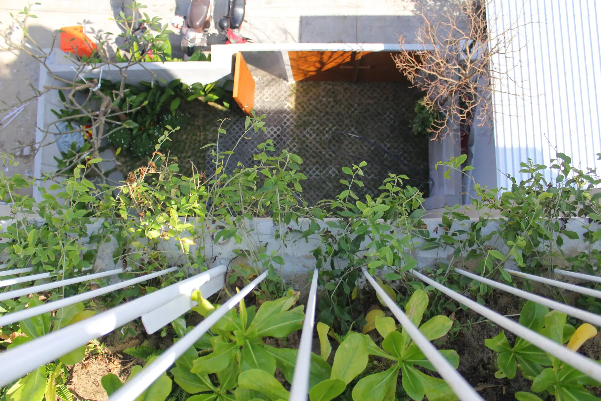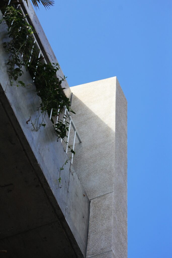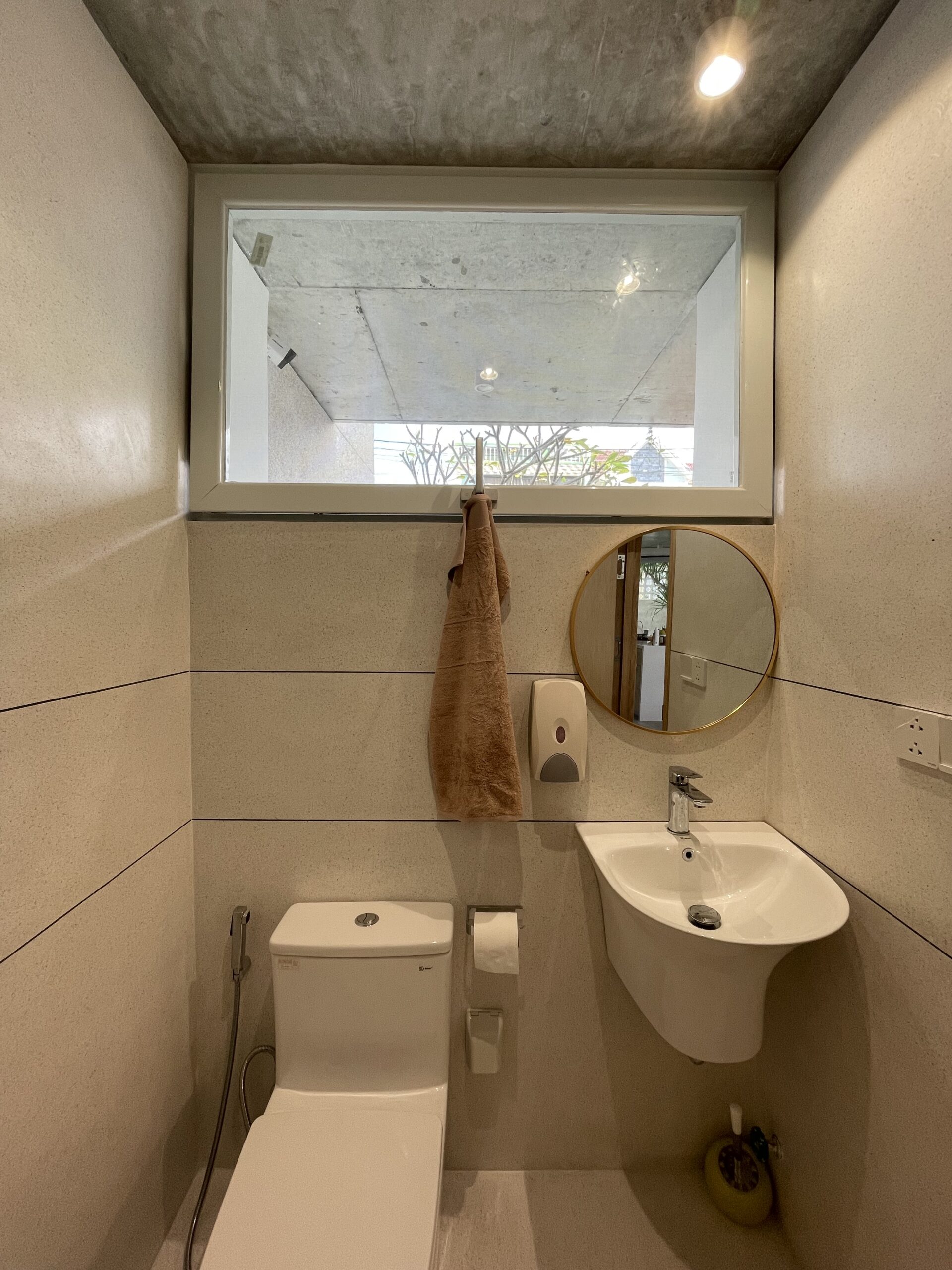 Sự kết hợp giữa chất liệu thô mộc của bê tông và sự ấm áp của gỗ tạo nên một tổng thể hài hòa và tinh tế. Bê tông mang đến sự vững chãi, hiện đại, trong khi gỗ mềm mại hóa không gian, tạo cảm giác gần gũi và thân thiện. Những mảng tường trắng tinh khôi là phông nền hoàn hảo để tôn lên vẻ đẹp của cây xanh và ánh sáng